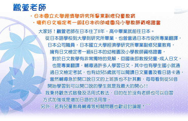 鸝萱老師為留日8年,畢業於日本研究所,回台後主要為日文家教老師,輔導過許多人考取日文檢定及商務人士,開口說日語,鸝萱老師擁有日文檢定一級證書,日本文部省頒發幼稚園級國小教師證書。目前也是專業翻譯,最開心的就是看到自己教的學生從不會說到開口說日文,就是最大的滿足!也發現學習日文其實是有技巧的,技巧性的學習及運用就不會花了大把銀子及時間仍不見效果。希望對日文有興趣的可以直接電話跟老師聯絡。 |